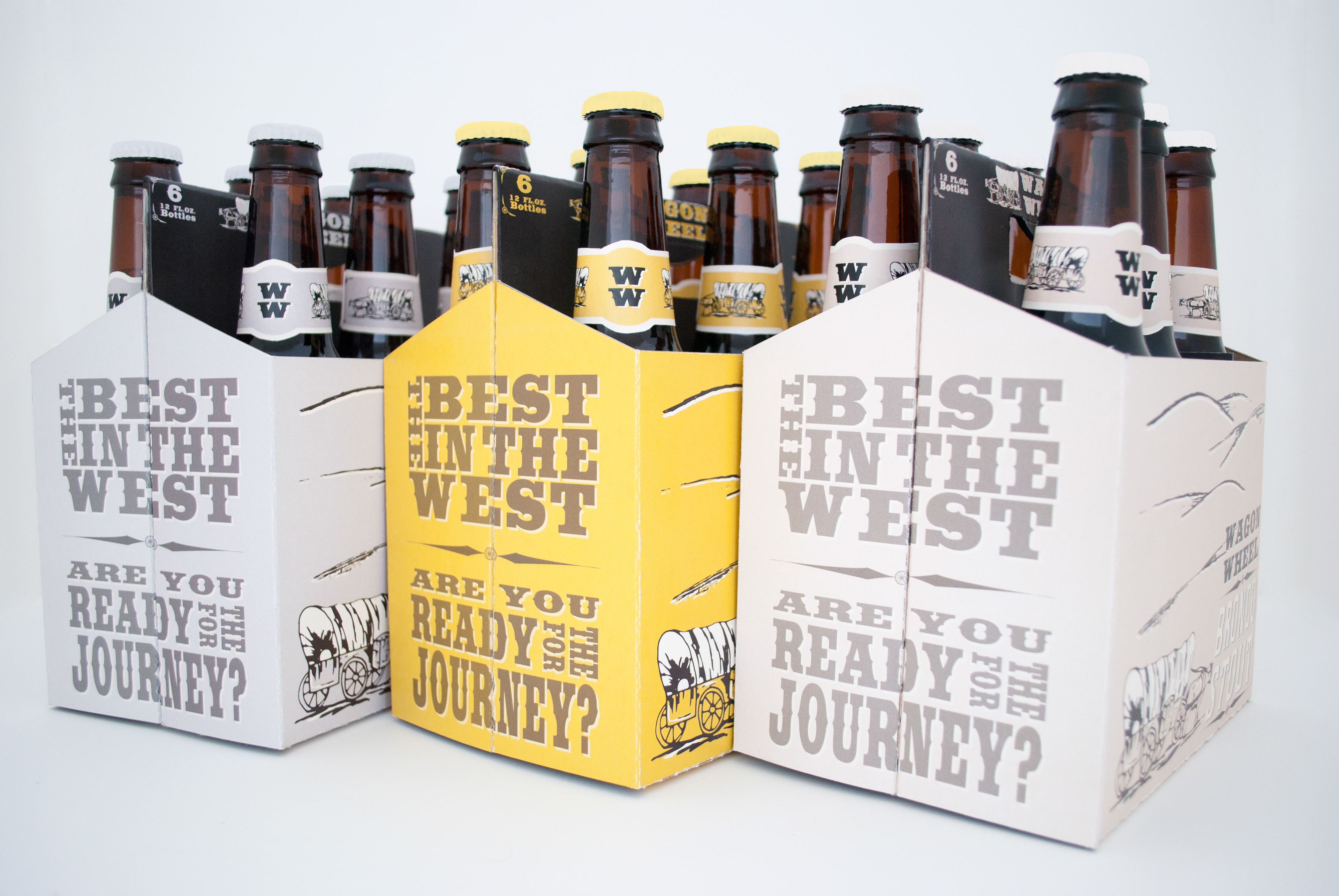 Wagon Wheel brings the spirit of the pioneer trail to you in a bottle. The packages have vintage colors along with a Western illustration that is contrasted by the tagline on the sides. The labels on the beer have the same color palette and type treatments, giving the product line a unified feel. The distressed wood typeface contrasted by hand-drawn type gives the labels and packaging an authentic Western feel.